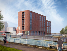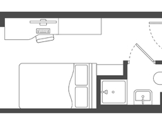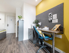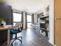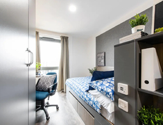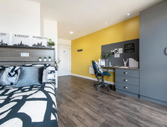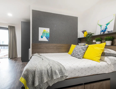 公寓位于伯明翰市中心,是一栋以现代化设计和高舒适度著称的学生公寓,主要提供 en-suite 房型,也有少量 studio 可选,房间带小双人床、独立卫浴、书桌椅、衣柜和床下储物等实用配置。
