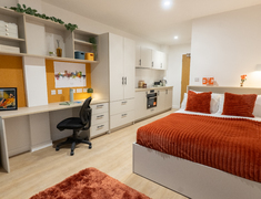 房间内部以实用房型为主,床型均为 3/4 床,睡感舒适;厨房配电磁炉、冰箱冰柜、微波炉(Studio 是组合烤箱),日常做饭方便;每间有独立电暖与不限量热水,冬天温暖不冻手,窗户可正常开启,通风效果好。公寓有 24 小时工作人员值守,遇到问题随时能找帮手;网络速度达 200MB,网课、追剧不卡顿;24 小时监控 + 门禁,住得安心;健身房器材全,瑜伽室能放松,还有社交区、游戏区、私人餐厅和学习区,学习休闲都能满足;提供自行车存放处和免费个人物品保险,细节贴心。