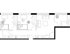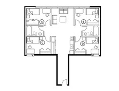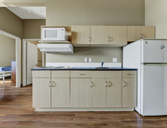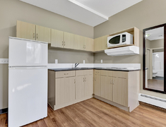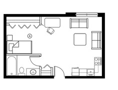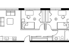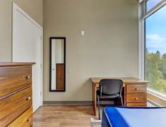 - 公寓套房内配有现代化厨房,含时尚橱柜、嵌入式微波炉与白色冰箱,搭配美观的木质地板及大尺寸镜子,兼顾实用性与居住质感,为学生提供舒适的生活空间。