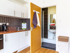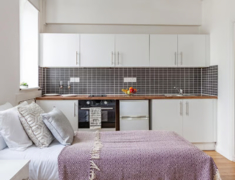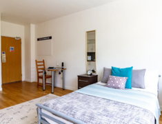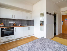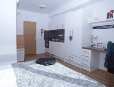 Studio(独立套房)设计现代,配套设施先进,包含独立卫浴,私人厨房以及充足的学习生活空间。房间具体包含配备齐全的个人独立卫浴,舒适宽大的床,床底丰富的储物空间,定制衣柜,平板电视等。私人厨房包括灶台,烤箱,微波炉,冰箱,耐用美观的工作台面等。