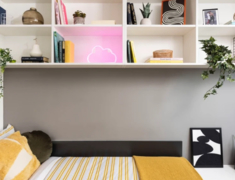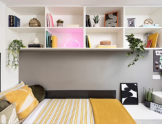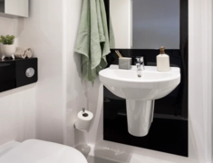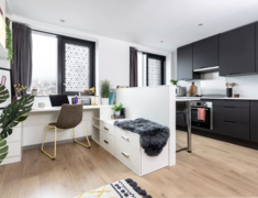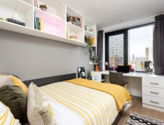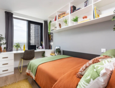 涵盖 3 种 Ensuite(5-10 人间)和 4 种 Studio 户型,Ensuite 面积约 11.5㎡,Studio 达 22.9㎡,均配小双人床 + 独立卫浴 + 充足储物空间,Studio 含独立厨房(烤箱 / 微波炉 / 冰箱齐全);窗户可开,高层享景观,冬季暖气 + 全屋高速 wifi,学习休息超舒适。